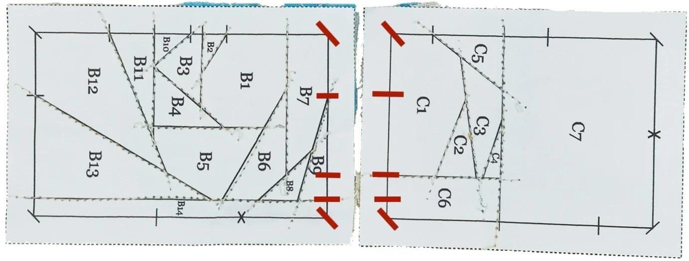 Once all your paper piecing templates are complete, it’s time to sew the sections together. Refer to the separate document labeled Sewing Order for the correct assembly sequence. For example, if it says C+B+A, sew sections C and B together first, then attach A to that combined piece.