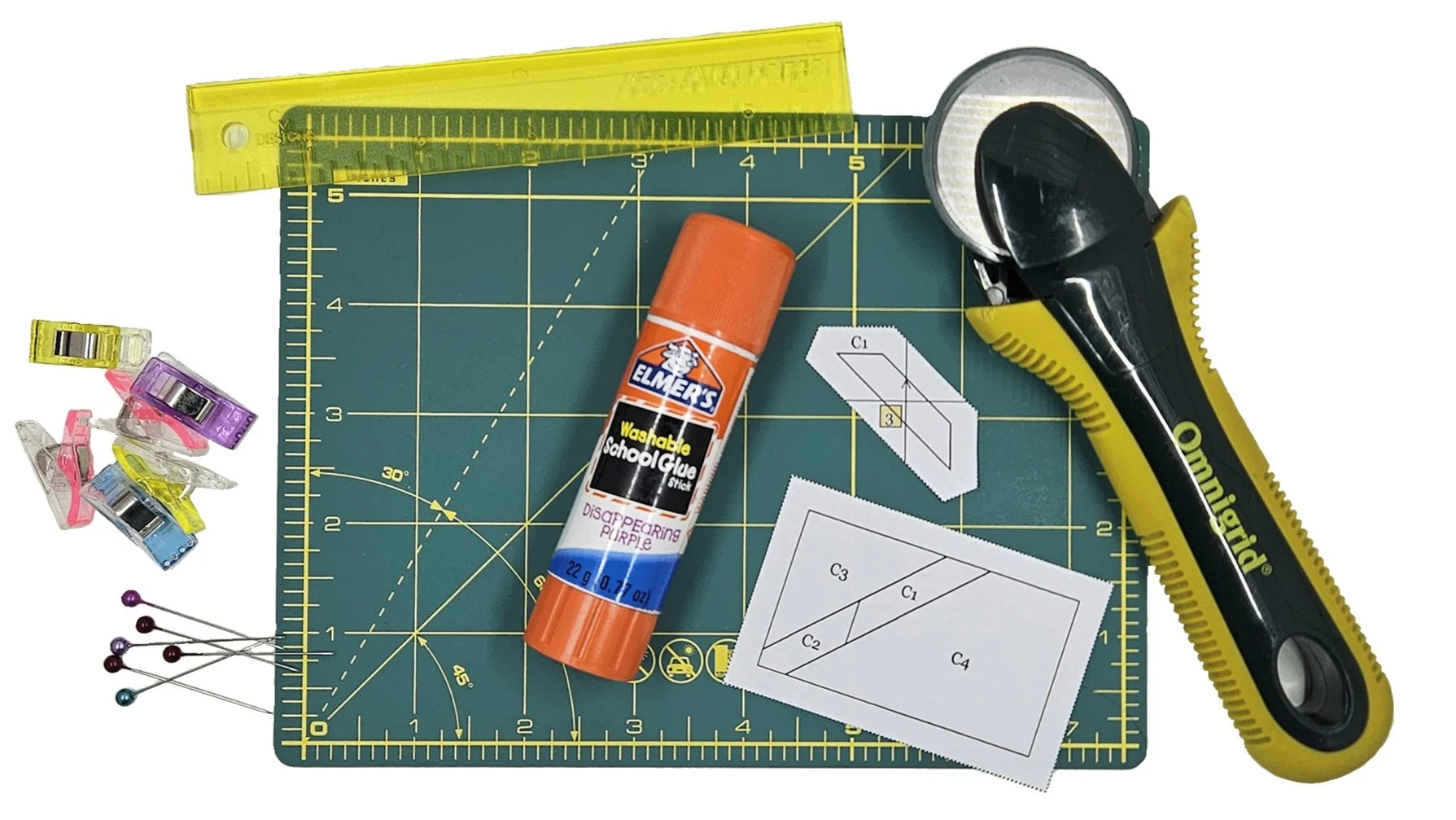 Each shape has a cutting template. For larger pieces, match and glue together templates at the numbered “glue edge” lines (extra paper can be left there for a stronger seam). Cut fabric roughly around each template, precision isn’t necessary, as you’ll trim while sewing.