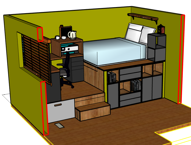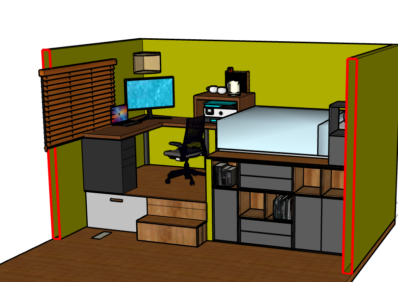 And so the seed was planted in my mind. I didn’t really think I could make this happen back in October 2021 when I started, but in my area $3,000 would pay maybe three months rent for a teeny tiny studio in a not great area. For the ability to keep living at home and keep my sanity I was willing to spend that price, but I definitely wanted to get more than just a bed out of it. I also wanted the bright colors gone, better organization, and if possible a larger desk that I could actually have a nice computer setup on. I measured my room (as well as I could when filled) and made a model of it in SketchUp. I had never used that program before and with an architecture degree in my future I wanted to see if I liked it and how it worked. Let me tell you it’s far easier to use than some other modeling programs I have learned over the last few years.