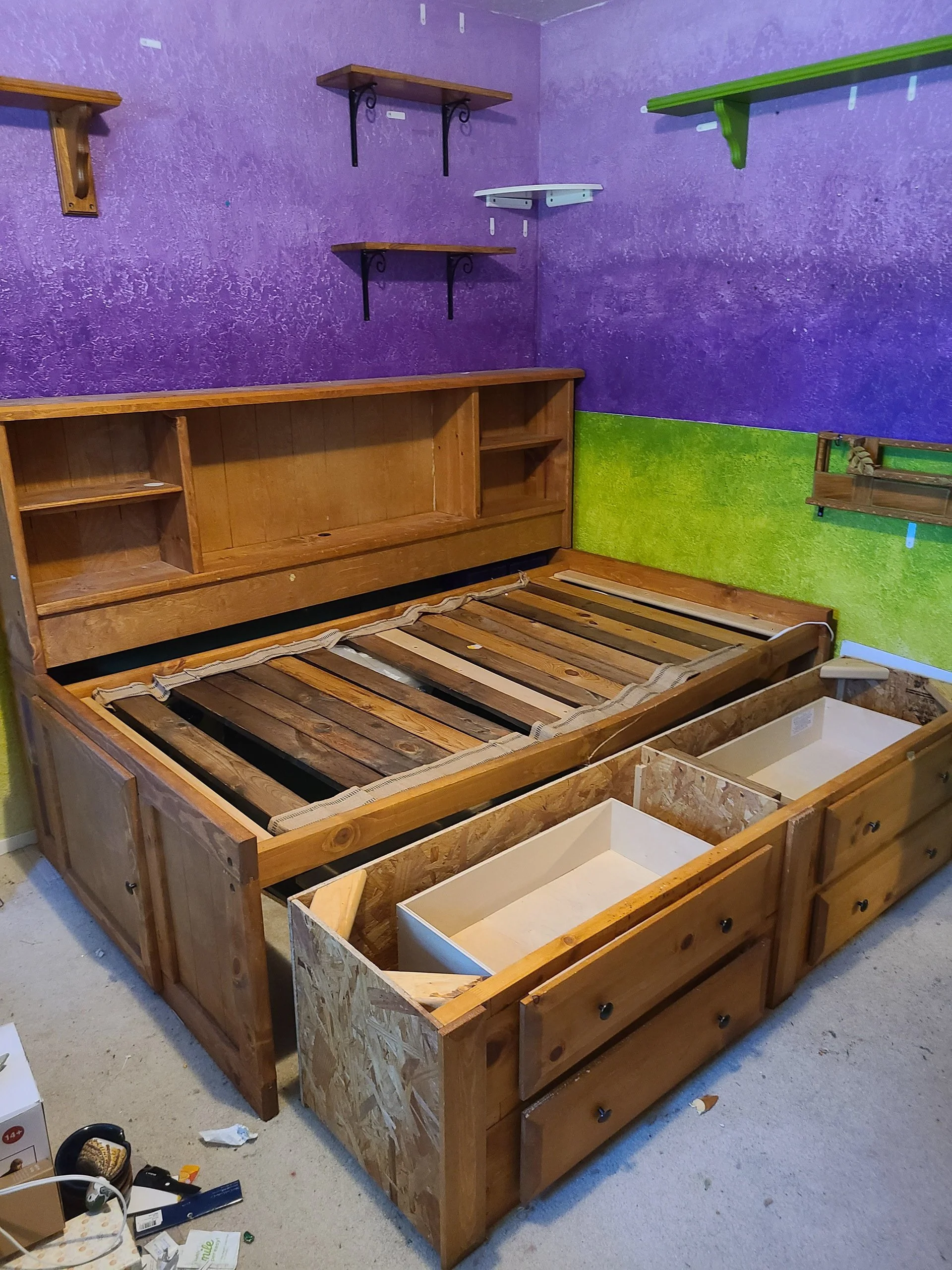 I would say the biggest motivating factor in this need for change now was getting a new bed. I have been sleeping terribly for years (still working on that) and I really didn’t want to spend money on another twin mattress. Now I had a new question of how do I fit a full size bed where a twin was? There was the simple solution, just switch them out. The way I used my twin captains bed had the drawers pulled out, so it was taking up about the same amount of space that a full would. The problem with this solution was it did nothing to solve my secondary problem which was a lack of storage and man are full bed frames with storage expensive. The only one I could find that would fit my needs was 3,000 dollars! I could make a whole new room with that!